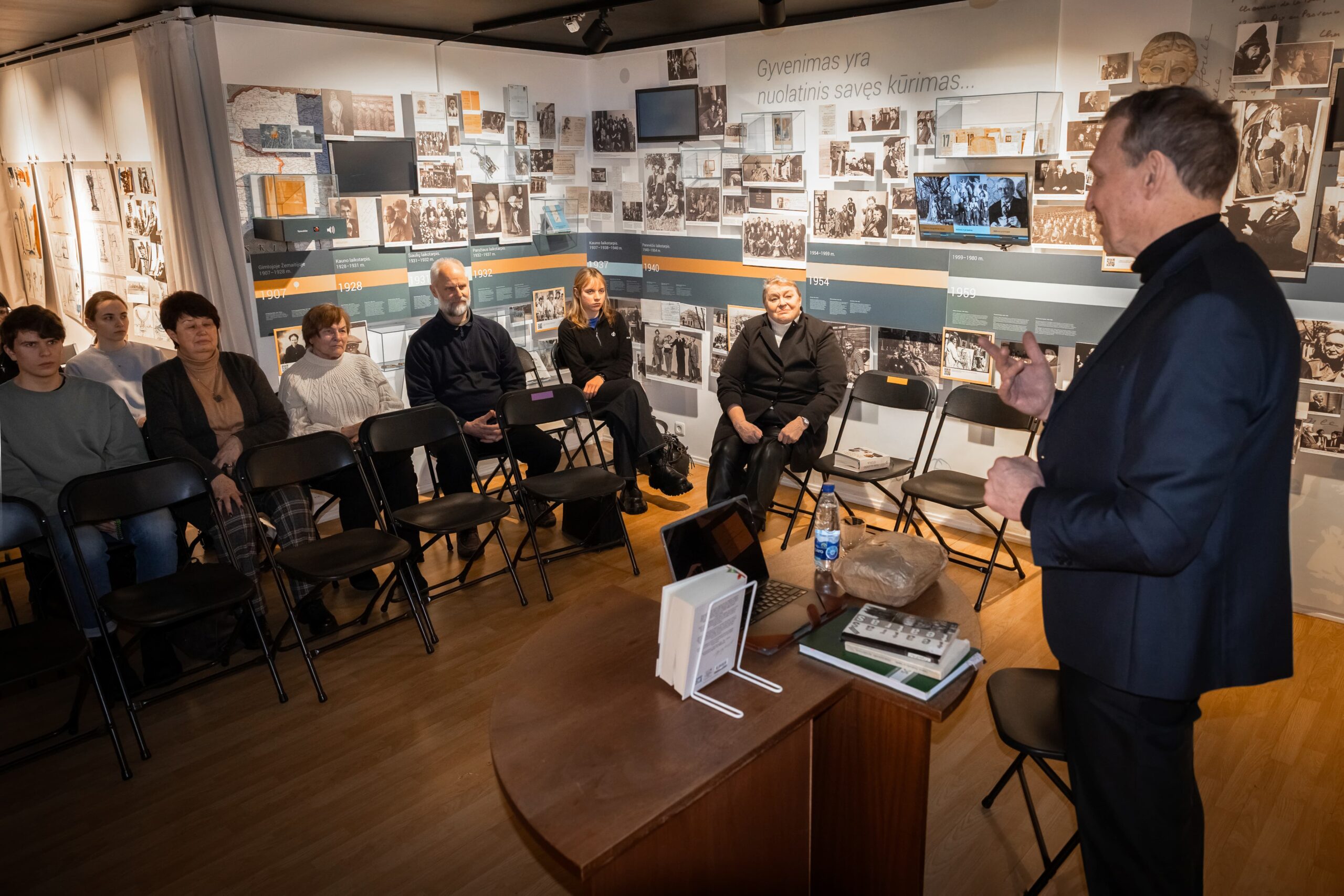 Penktadienio popietę moksleiviai ir ištikimiausi filosofo Arvydo Juozaičio sekėjai rinkosi Juozo Miltinio memorialiniame bute, priklausančiame Panevėžio apskrities Gabrielės Petkevičaitės-Bitės viešajai bibliotekai.